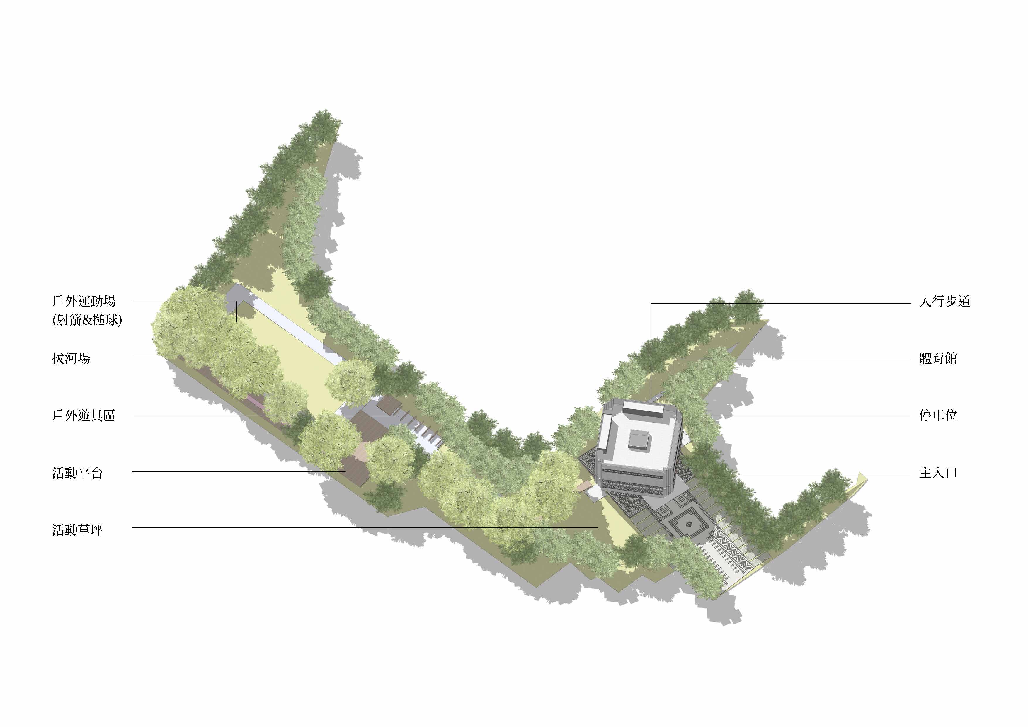 基地位於桃園市,為提供附近眾多原住民部落之文化運動場域而進行整體規劃設計。巨石是眾多原住民族的文化交集,本案以此為意象設計體育場館。建築物的地面與立面皆以圖騰作為點綴,也藉機表現原住民族的文化。整體以鋼構為主要構造,目標在爭取最大的室內跨距,供原住民族祭典時能盡可能容納最多人數。